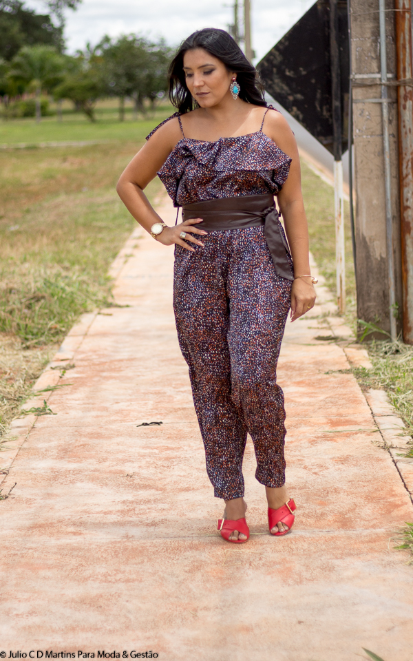 Para deixar a cintura marcada, escolhi o cinto mais grosso com laço na lateral. Como o macacão é reto é curto, escolhi a mule, que é tendência e é um modelo super confortável - e eu adoro.